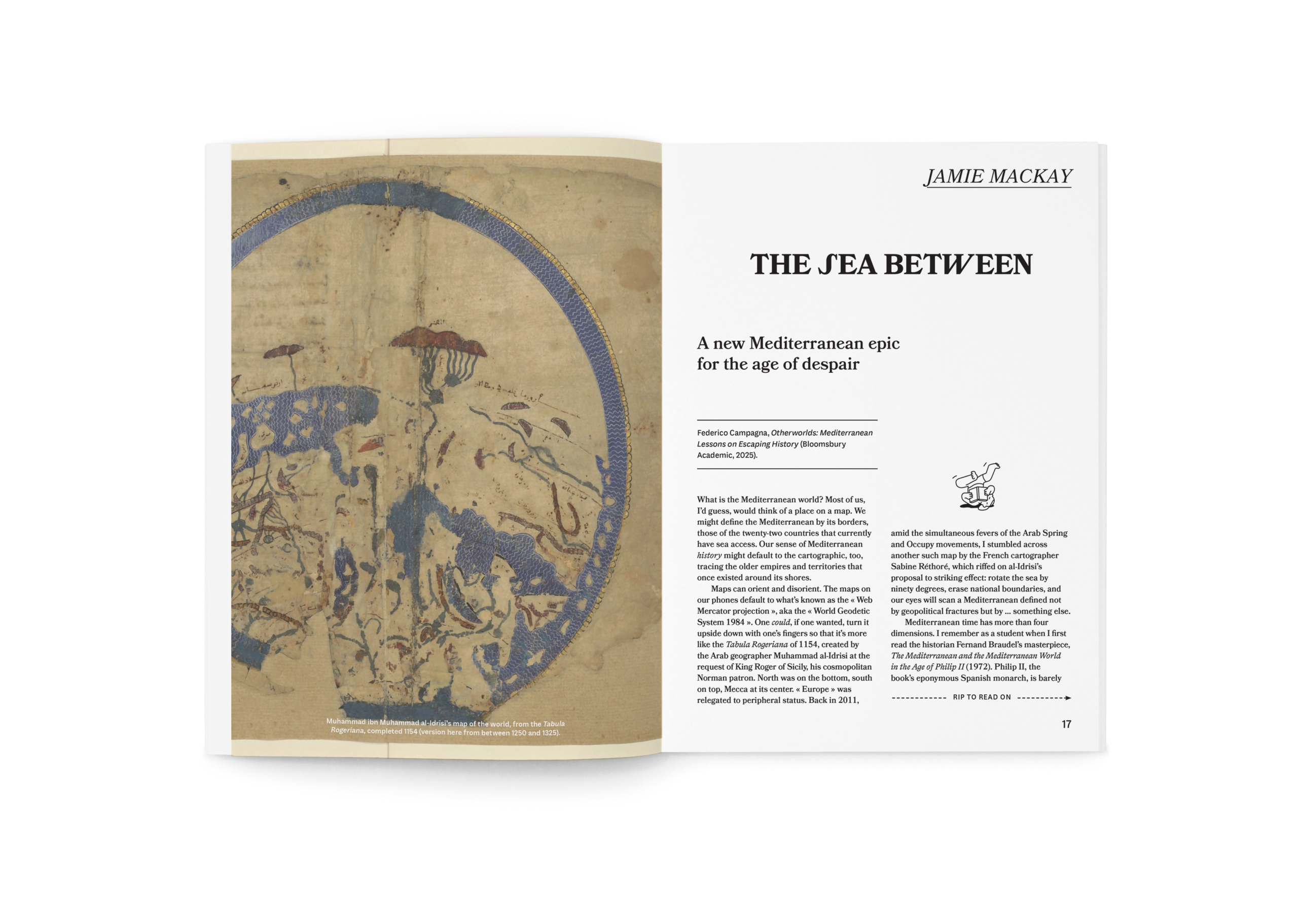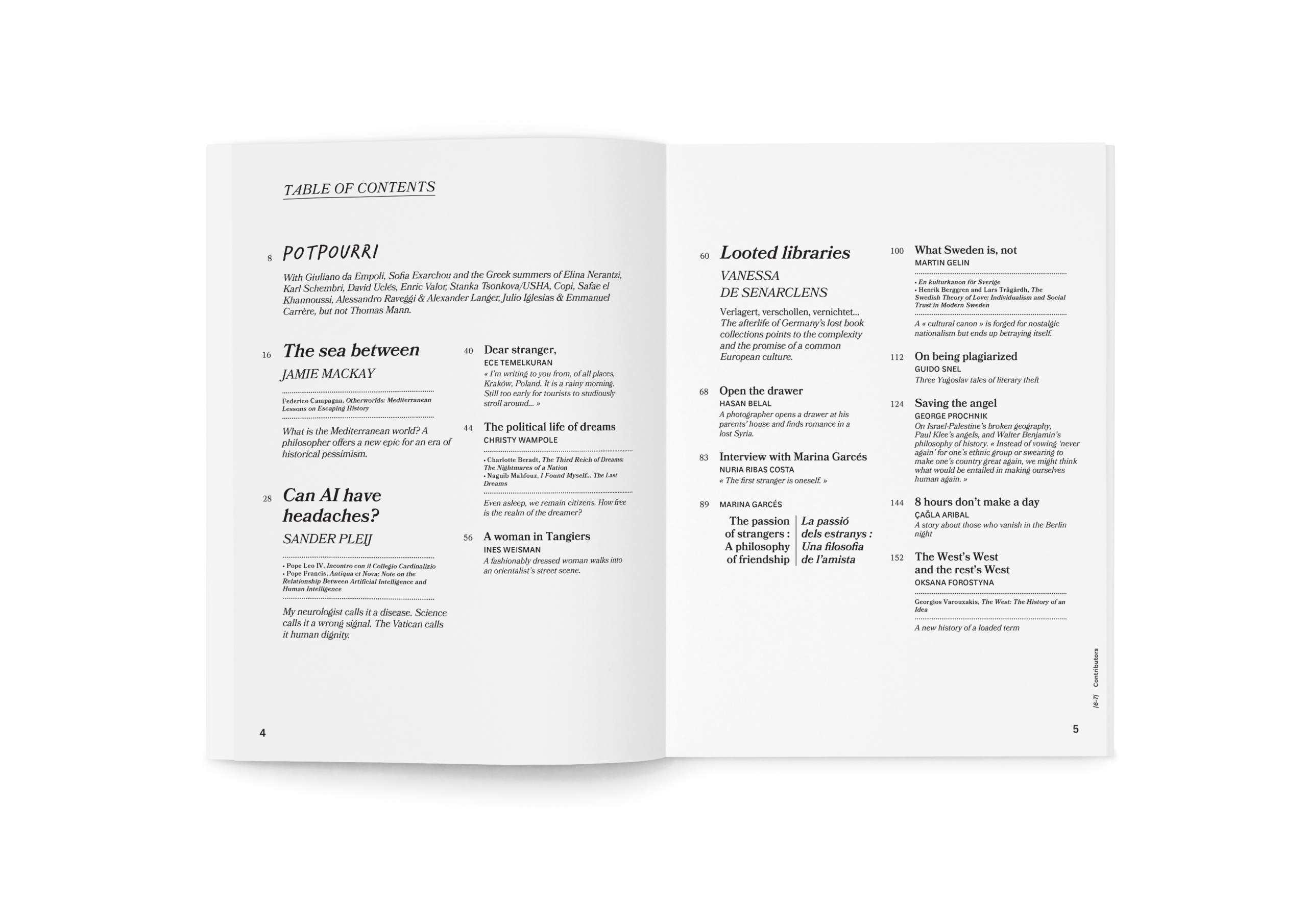 Black on white, with a glint of copper. And inside: the Mediterranean as a sea between; dreams, and their political life; headaches — human, divine, and artificial. A woman steps in Tangiers; looted libraries whisper their afterlives; strangers write to strangers. What Sweden isn’t; Yugoslav tales of literary theft ascending; an angel is saved — or not — in a broken geography. Eight hours that don’t make a day, and the question of what the West means to the rest.