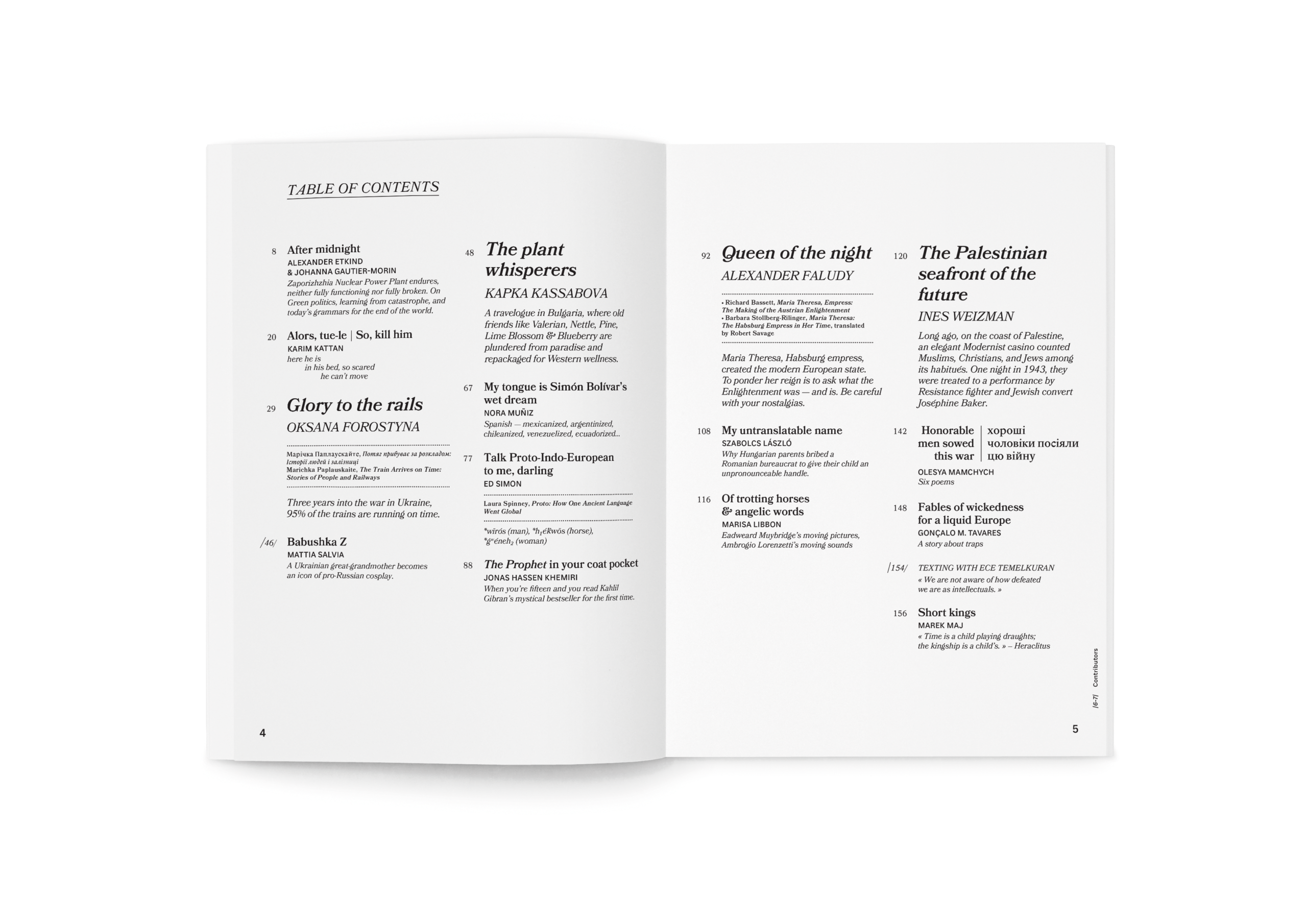 Blue, this time with a layer of aquamarine. Zaporizhzhia’s nuclear plant, rails that still run through Ukraine’s war, and a Ukrainian great-grandmother turned icon of pro-Russian cosplay. Plants in Bulgaria repackaged for Western wellness and Bolívar’s tongue stretched across continents. Untranslatable names, Joséphine Baker on Palestine’s seafront, and wicked fables for a liquid Europe.
