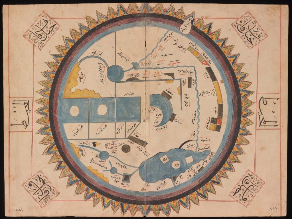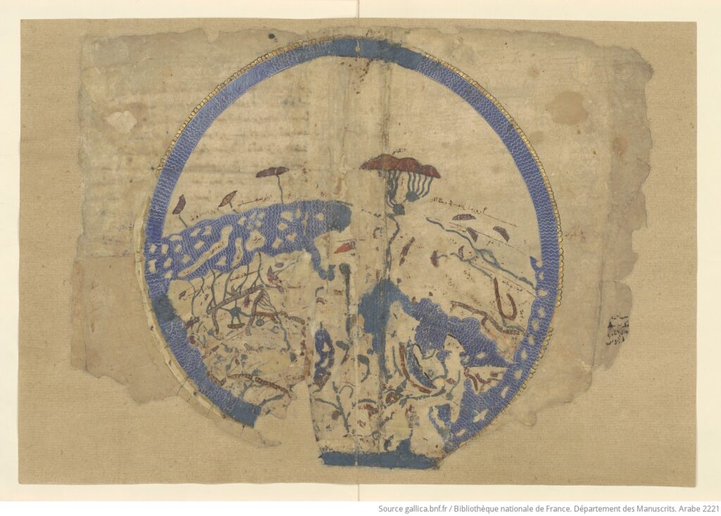 Maps can orient and disorient. The maps on our phones default to what’s known as the « Web Mercator projection », aka the « World Geodetic System 1984 ». One could, if one wanted, turn it upside down with one’s fingers so that it’s more like the Tabula Rogeriana of 1154, created by the Arab geographer Muhammad al-Idrisi at the request of King Roger of Sicily, his cosmopolitan Norman patron. North was on the bottom, south on top, Mecca at its center. « Europe » was relegated to peripheral status. Back in 2011, amid the simultaneous fevers of the Arab Spring and Occupy movements, I stumbled across another such map by the French cartographer Sabine Réthoré, which riffed on al-Idrisi’s proposal to striking effect: rotate the sea by ninety degrees, erase national boundaries, and our eyes will scan a Mediterranean defined not by geopolitical fractures but by … something else.