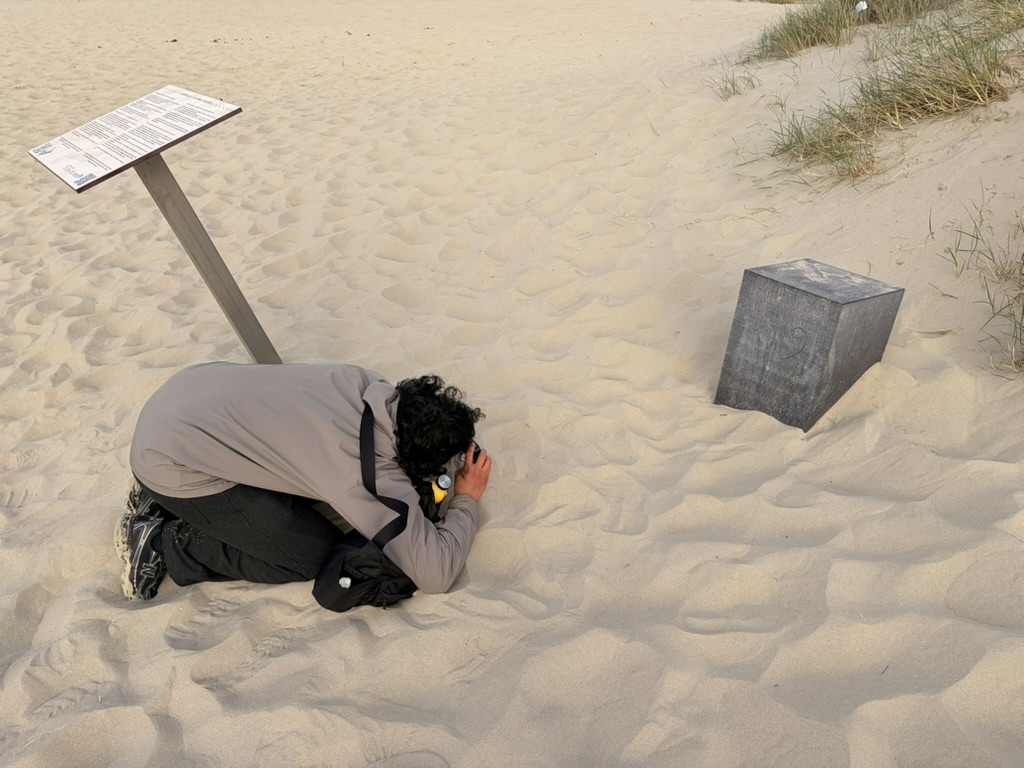 We keep walking. At some point we pass a large, strange squared-circle structure in the sand, easily four metres tall. We note it and move on. The border must be close. It’s getting late, and we have the last train to catch; getting stranded on the beach is not on the bucket list.