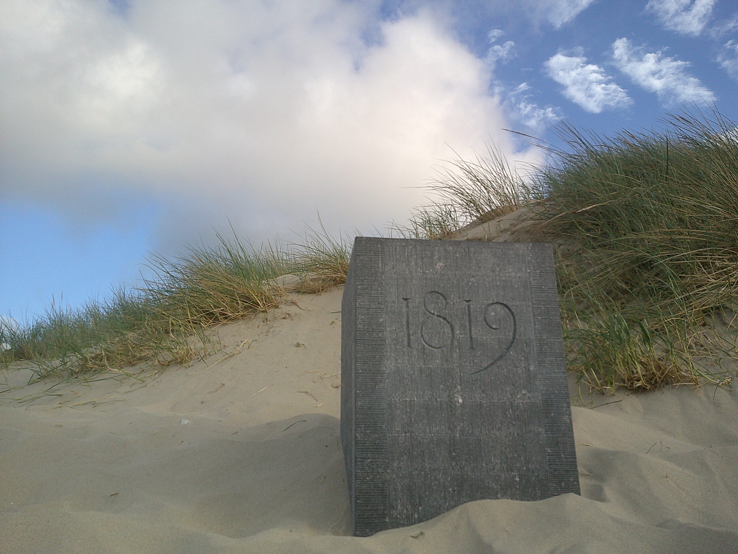 We turn back, searching. And then we see it: a small squared stone, right where the dunes become dry grass. It says 1819, which I later look up — that’s when the stone was put here. The stone looks oddly out of place, and it also happens to mark France’s northernmost point.
